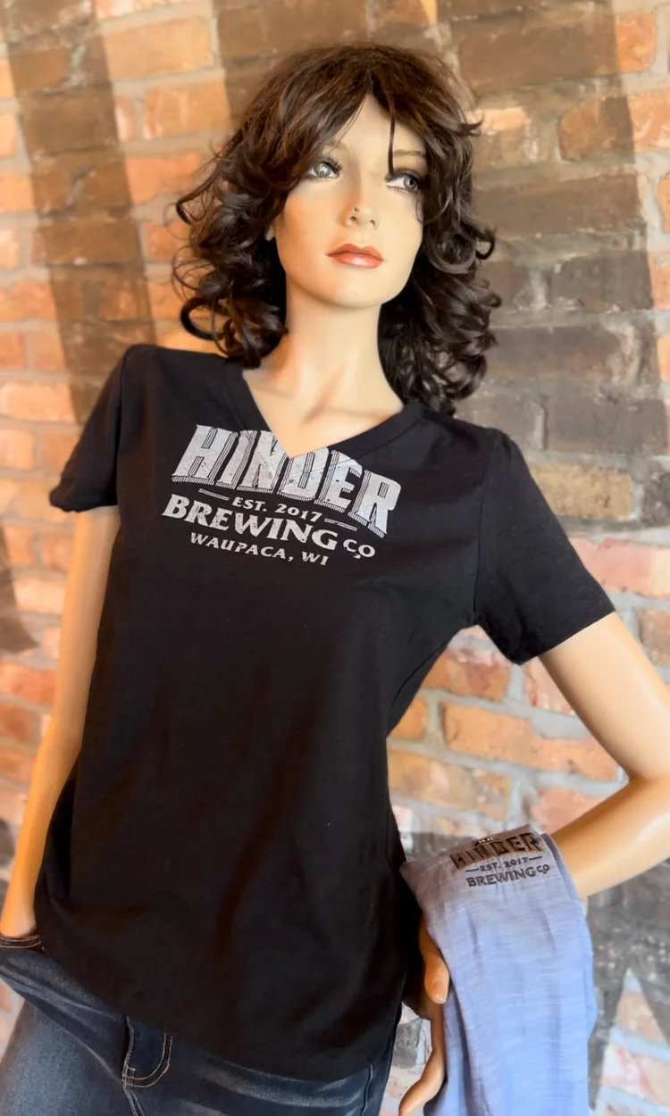 V-neck, Black short sleeve Tshirt with White Lettering.